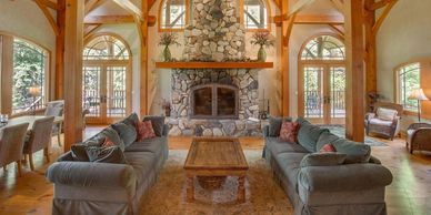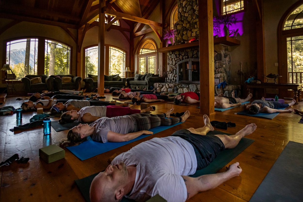 Huge timber frames, a 30 ft river rock fireplace, and room for 25+ to practice; this home offers us ample space for yoga, play, fitness, and community.